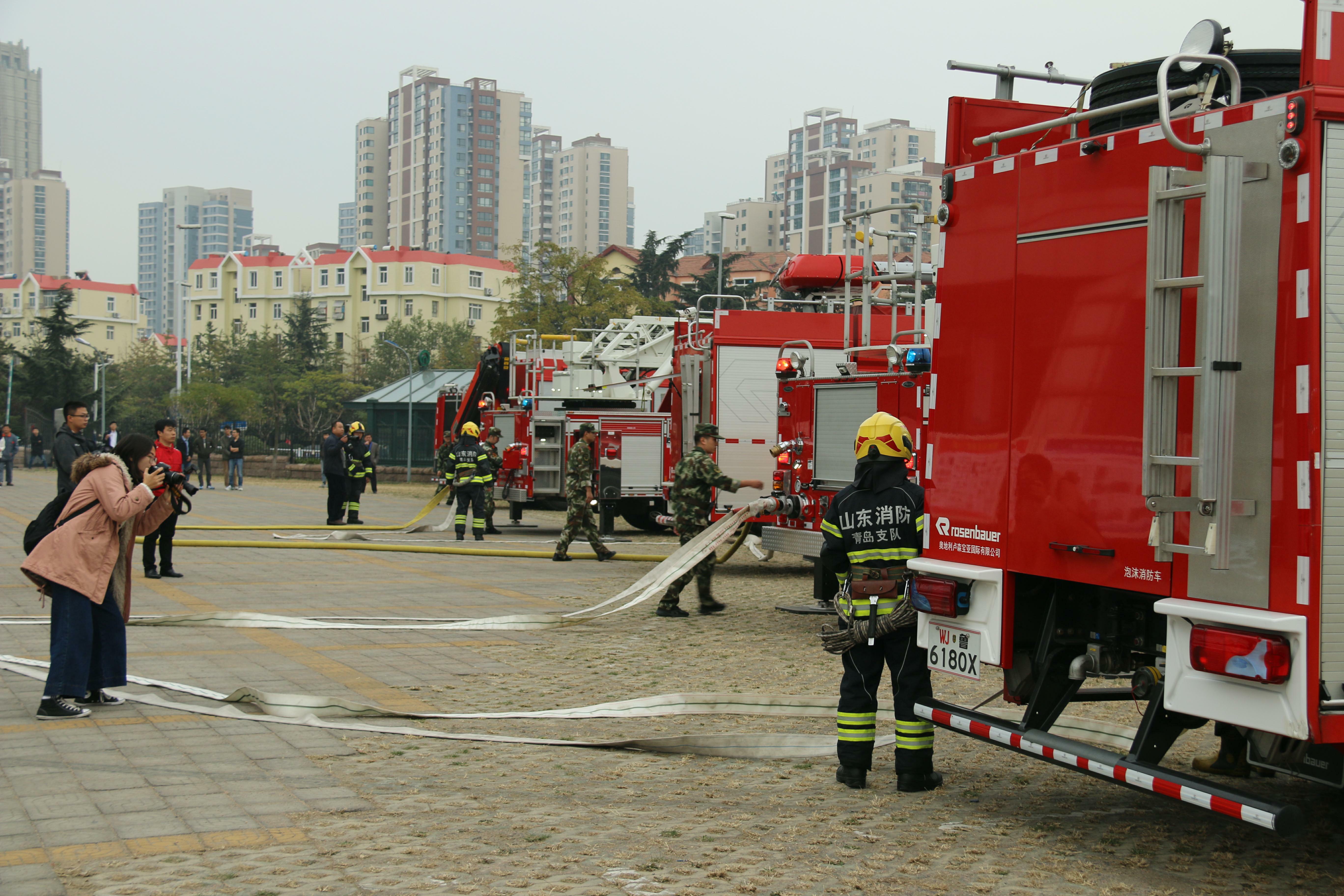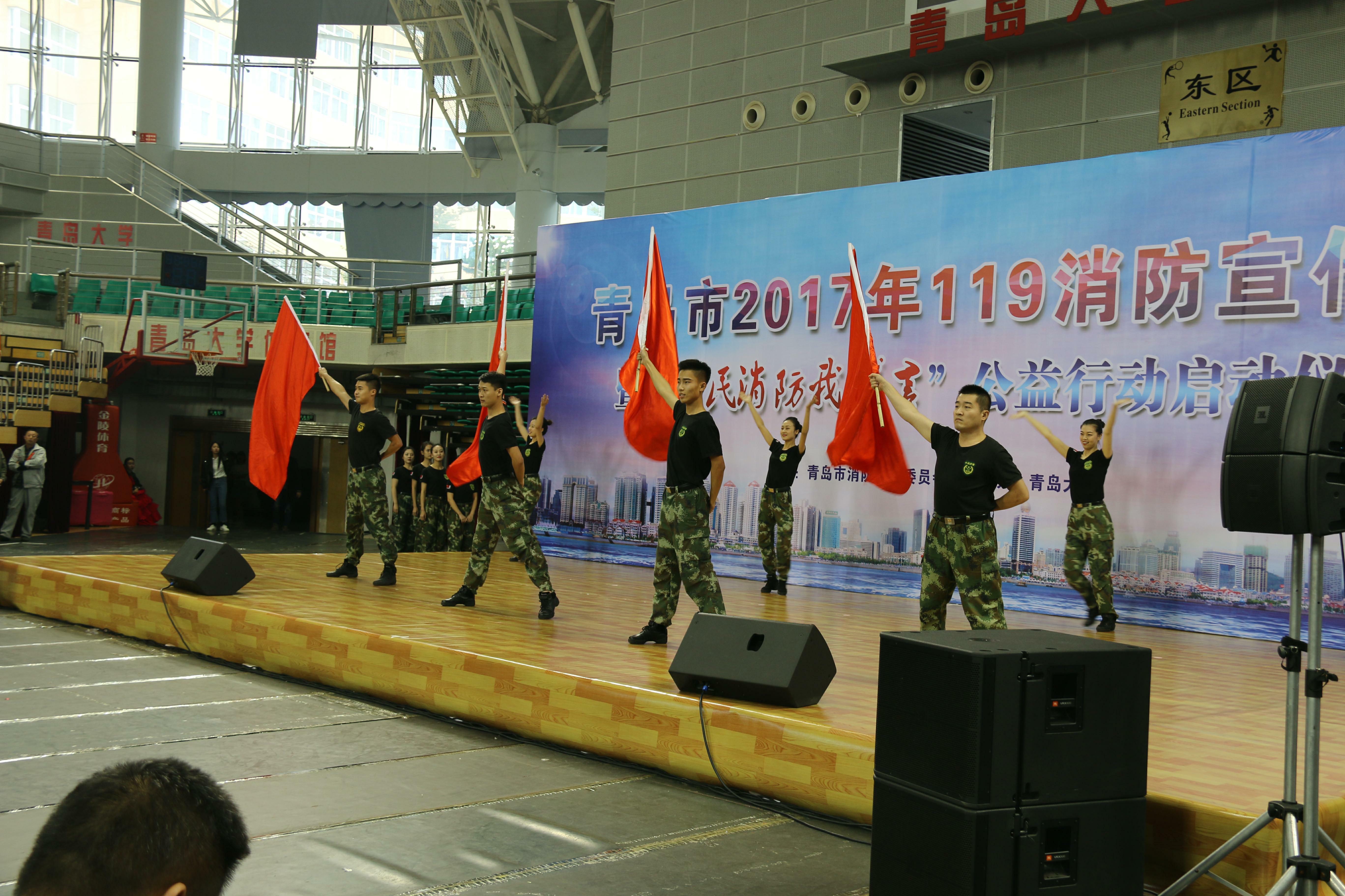 在119消防日来临之际,为全力打造“和谐青岛”、“平安校园”,11月1日下午我校与市公安消防支队在体育馆联合举办了“青岛市119消防安全月暨‘全民消防我代言’公益行动启动仪式”和我校119消防宣传月消防逃生演练。青岛市副市长、市公安局局长闫希军,我校党委书记、校长范跃进,党委常委、副校长邵彬等领导出席了启动仪式,仪式由市政府办公厅副主任林万松主持。
